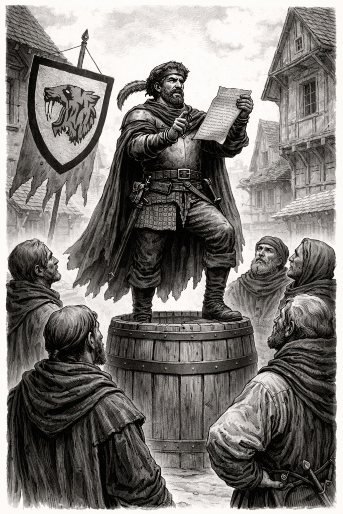 „Kommt zu den Tiger-Söldnern! Seht mehr von Magira und erwerbt dabei Geld und Ruhm! Wer mit Waffen umgehen kann und gesund ist, wird angenommen!“ – Neben den wolsichen Schriftzeichen war ein imposanter Tigerkopf abgebildet, auf der anderen Seite ein gut ausgerüsteter Schwertkämpfer in den Farben der Tigersöldner, der den Beobachter entschlossen anblickte, eine Hand voll Münzen in der offenen Hand. Um den Tisch, an dem die Werber saßen, standen mehrere Bewerber unterschiedlichen Alters. Die meisten sahen wie Bauern oder Hirten aus. Ein glatt rasierter Mann mit völlig weißem Haupthaar fiel Helmnot ins Auge. Nach einem Blick in das wettergegerbte Gesicht musste er seine Altersschätzung revidieren, der Mann war höchsten dreißig Sommer alt, vermutlich jünger. Seine Lederweste und die wolsischen Sandalen waren abgetragen aber ordentlich, seine angespannte Körperhaltung und sein wachsamer Blick, dem nichts in der überfüllten Gaststube zu entgehen schien, sprachen für einen erfahrenen Kämpfer.